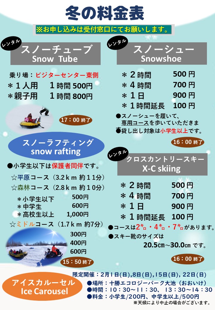 12月20日(土)より冬のアクティビティが全て営業開始となります。スノーチューブ、スノーラフト、クロスカントリースキー、スノーシューなど気軽に楽しめる冬の遊びが満載です。週末はぜひ、エコパに遊びに来て下さい。